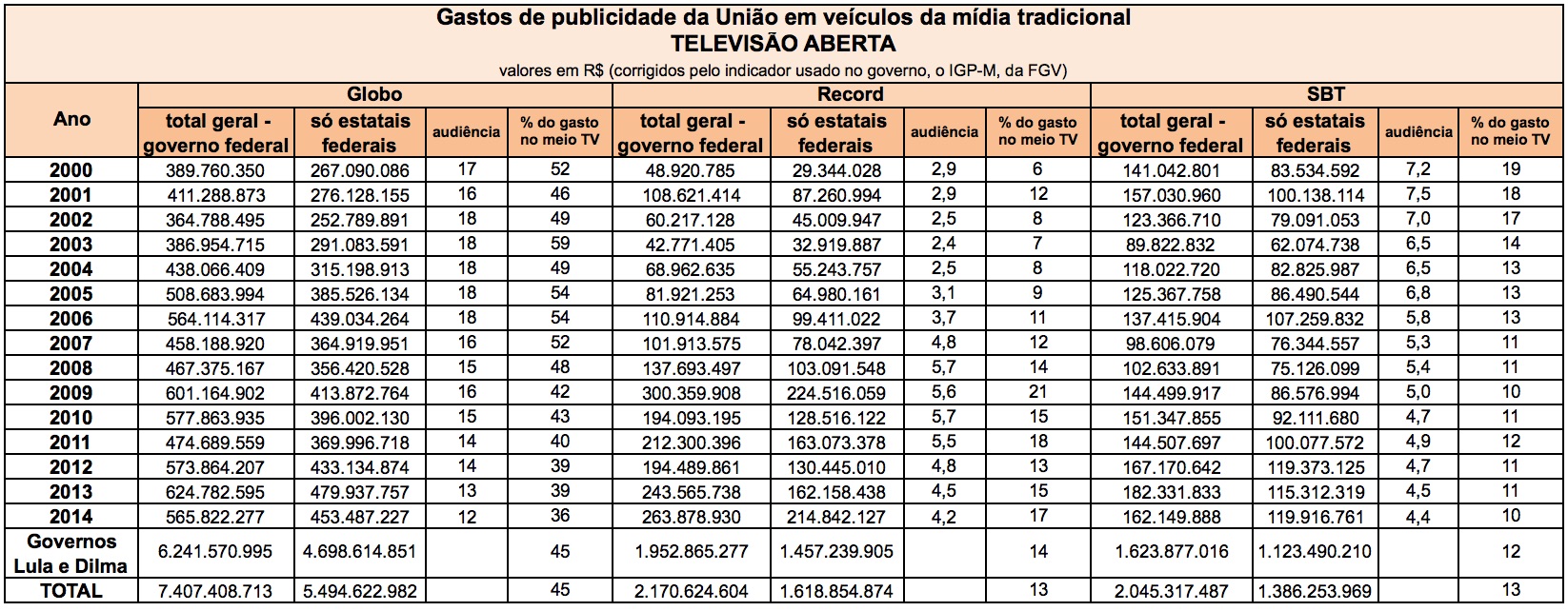 A Rede Globo e as 5 emissoras de propriedade do Grupo Globo (em São Paulo, Rio de Janeiro, Minas Gerais, Brasília e Recife) receberam um total de R$ 6,2 bilhões em publicidade estatal federal durante os 12 anos dos governos Lula (2003 a 2010) e Dilma (2011 a 2014).